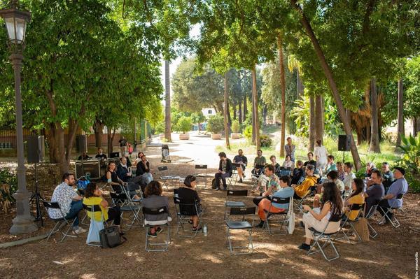 B ajo los árboles del jardín del Casino de la Exposición , dio comienzo la segunda sesión de la jornada ' Paisajes